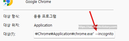 - 대상 위치에 다음을 입력합니다: "C:\\Program Files\\Google\\Chrome\\Application\\chrome.exe" --incognito