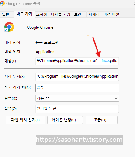 - 대상 위치에 다음을 입력합니다: "C:\\Program Files\\Google\\Chrome\\Application\\chrome.exe" --incognito