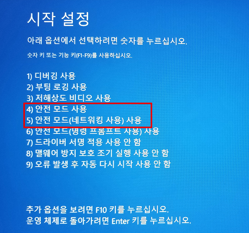 - 원하는 옵션을 선택하여 안전모드로 부팅합니다.