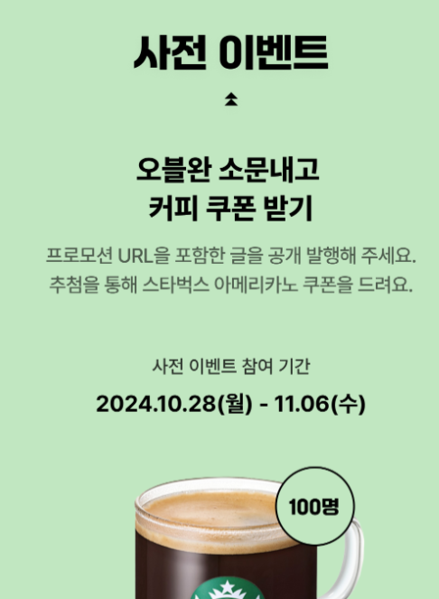 - 혜택: 추첨을 통해 100명에게 스타벅스 아메리카노 쿠폰을 드립니다.