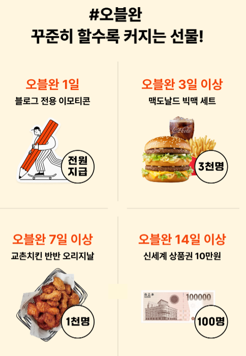 오블완 챌린지에 참여하시면 다양한 혜택을 받으실 수 있습니다. 참여 일수에 따라 혜택이 커집니다!