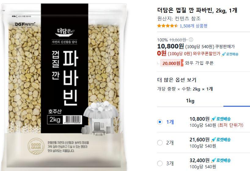 껍질없는 파바빈 물에 2시간 이상 불리기