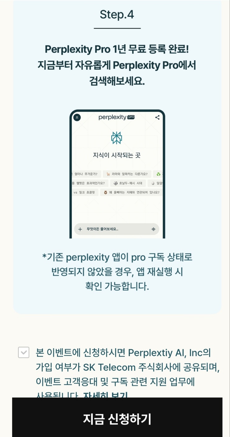 3) 신청 완료: 간단한 절차를 따라 신청을 완료하면, 1년 동안 퍼플렉시티 프로를 무료로 이용할 수 있습니다.