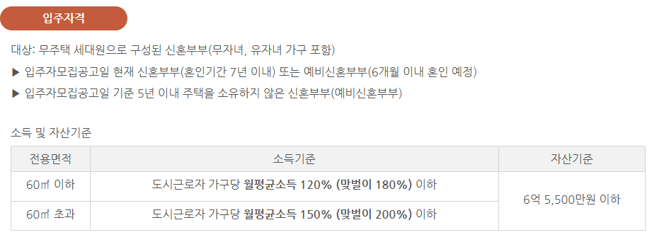 - 전용 60㎡ 이하 신청 시 → 소득 기준 120% 이하 (맞벌이 180%)